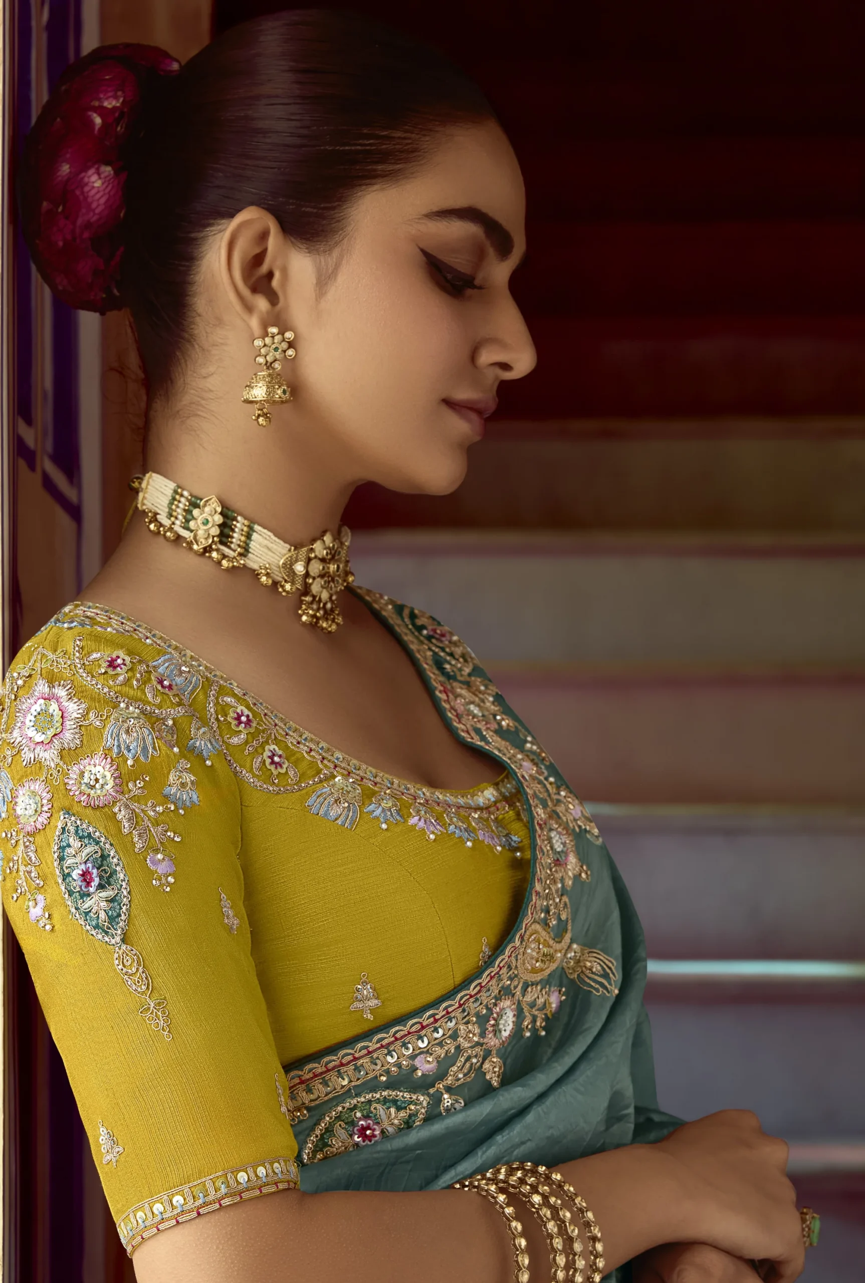 The muted slate blue tone offers a sophisticated and graceful look, ideal for parties and festive occasions. Finished with a stylish fancy blouse featuring embroidery, this saree is designed to reflect modern luxury with ethnic finesse.