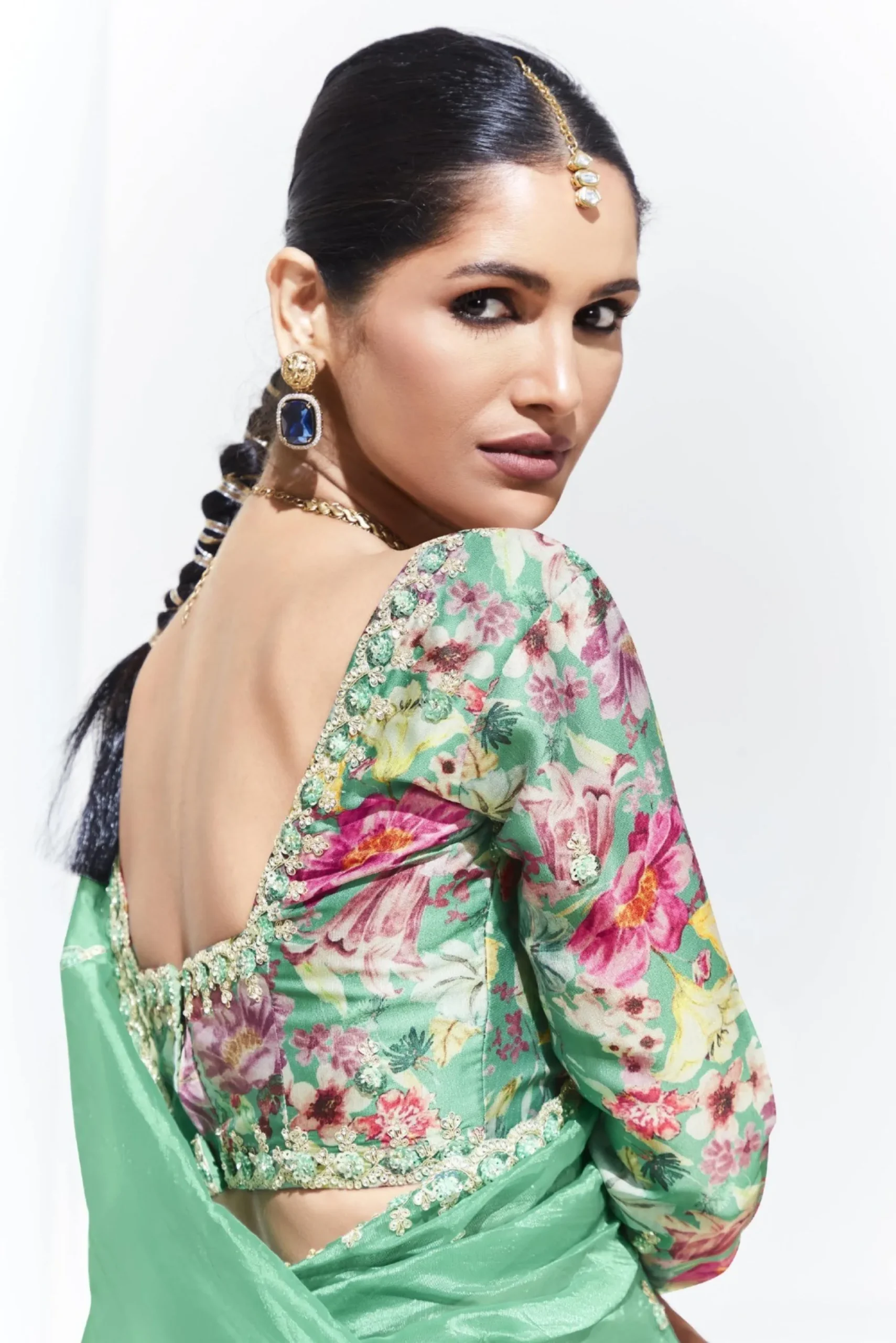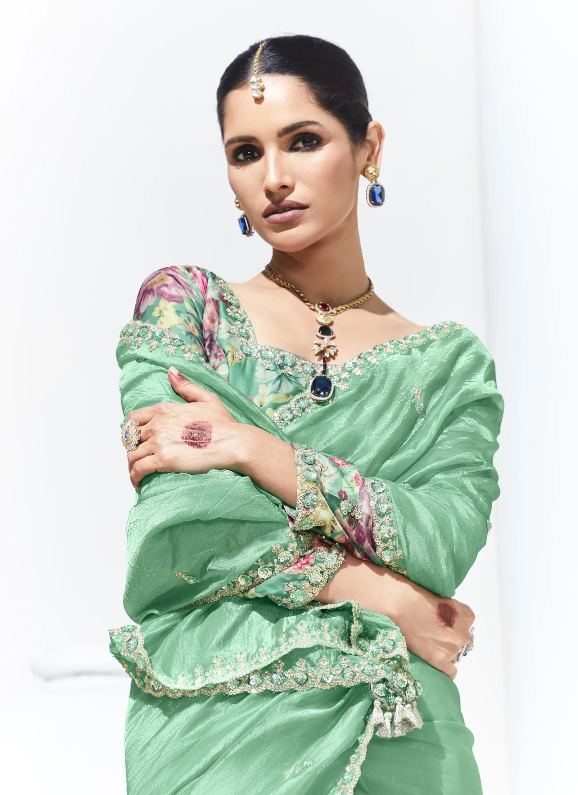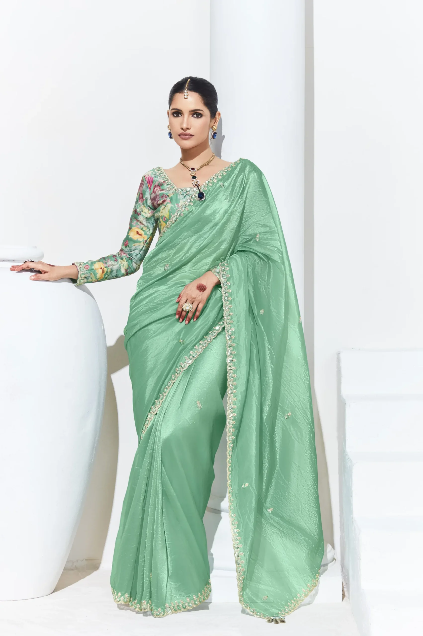 A soft glass tissue saree with refined embroidery, paired with a statement satin silk blouse for polished festive styling.