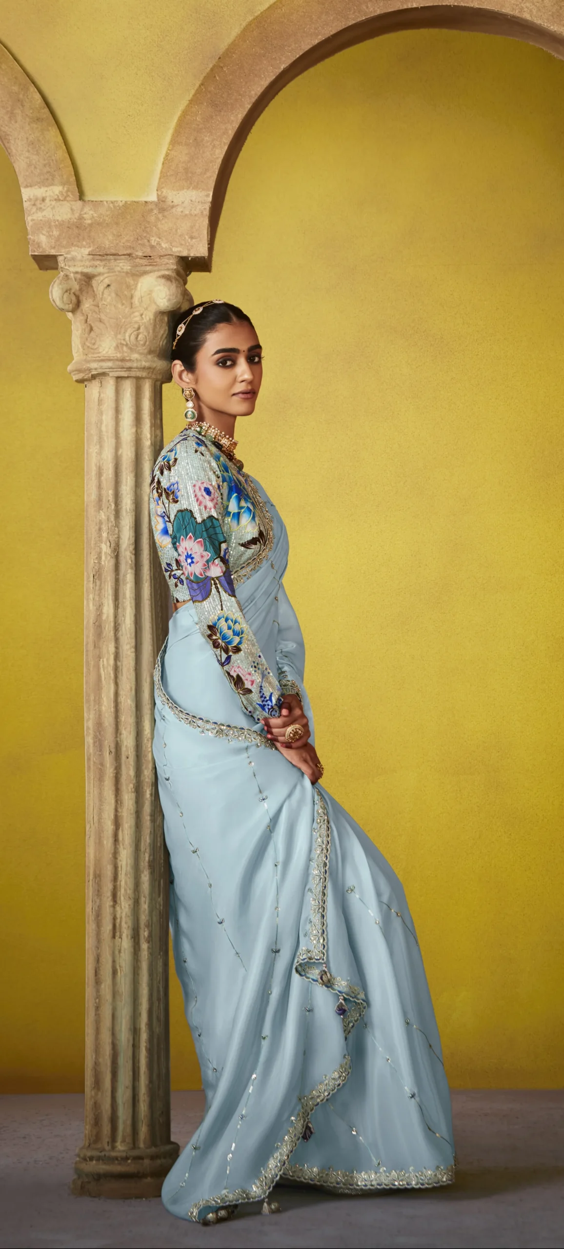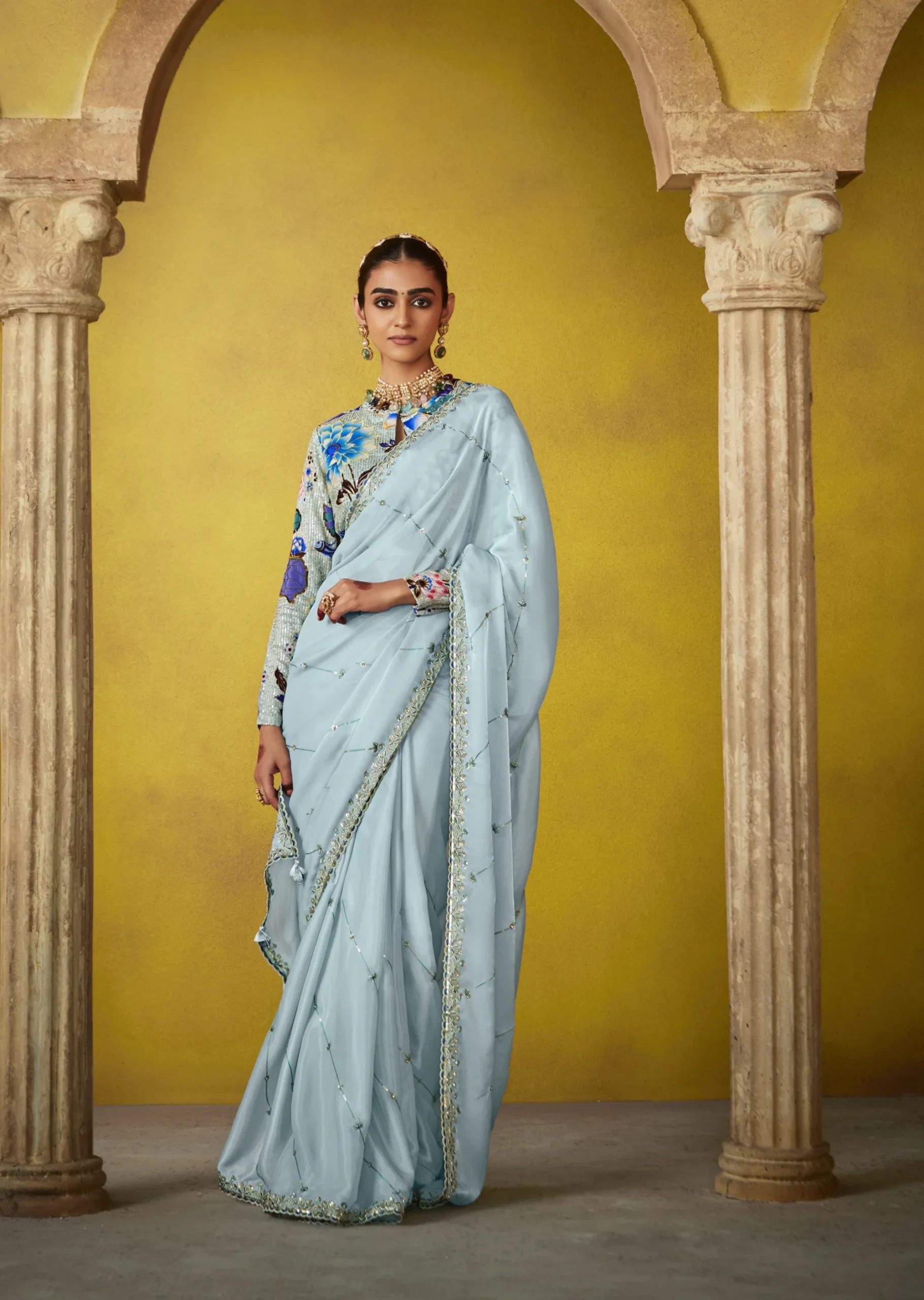 Light, luminous, and refined — this glass tissue saree features intricate butti work with sequins and thread embroidery across the border.