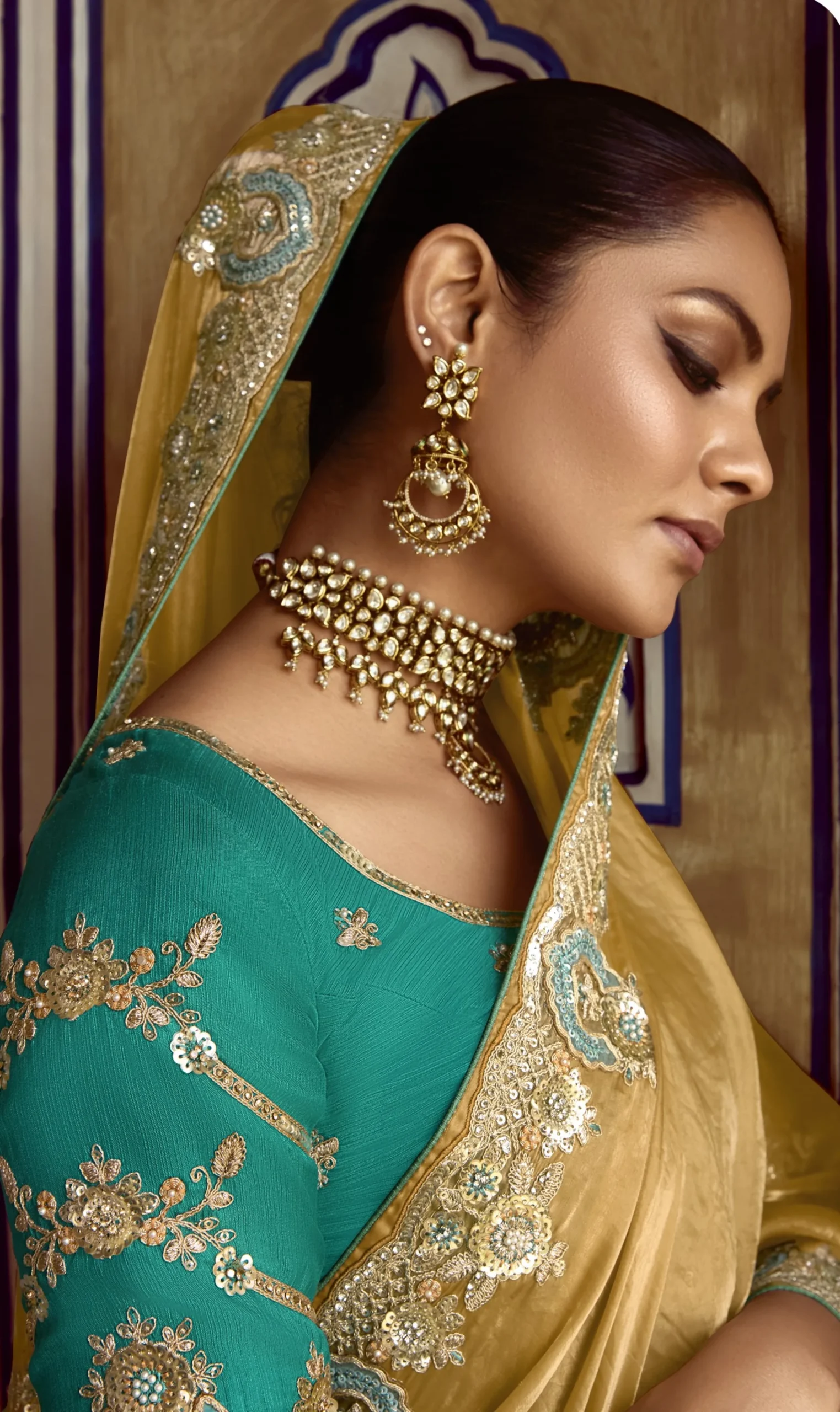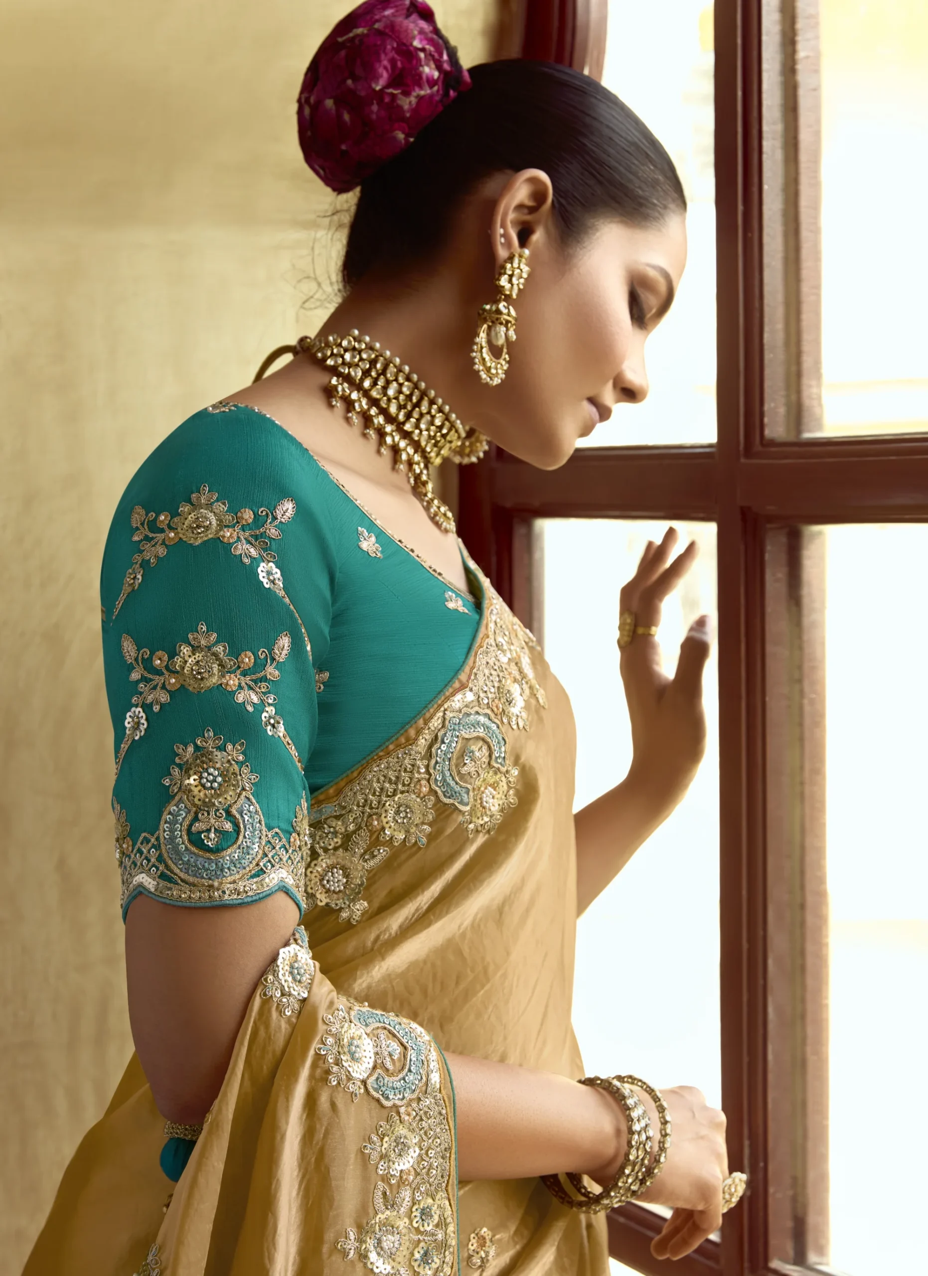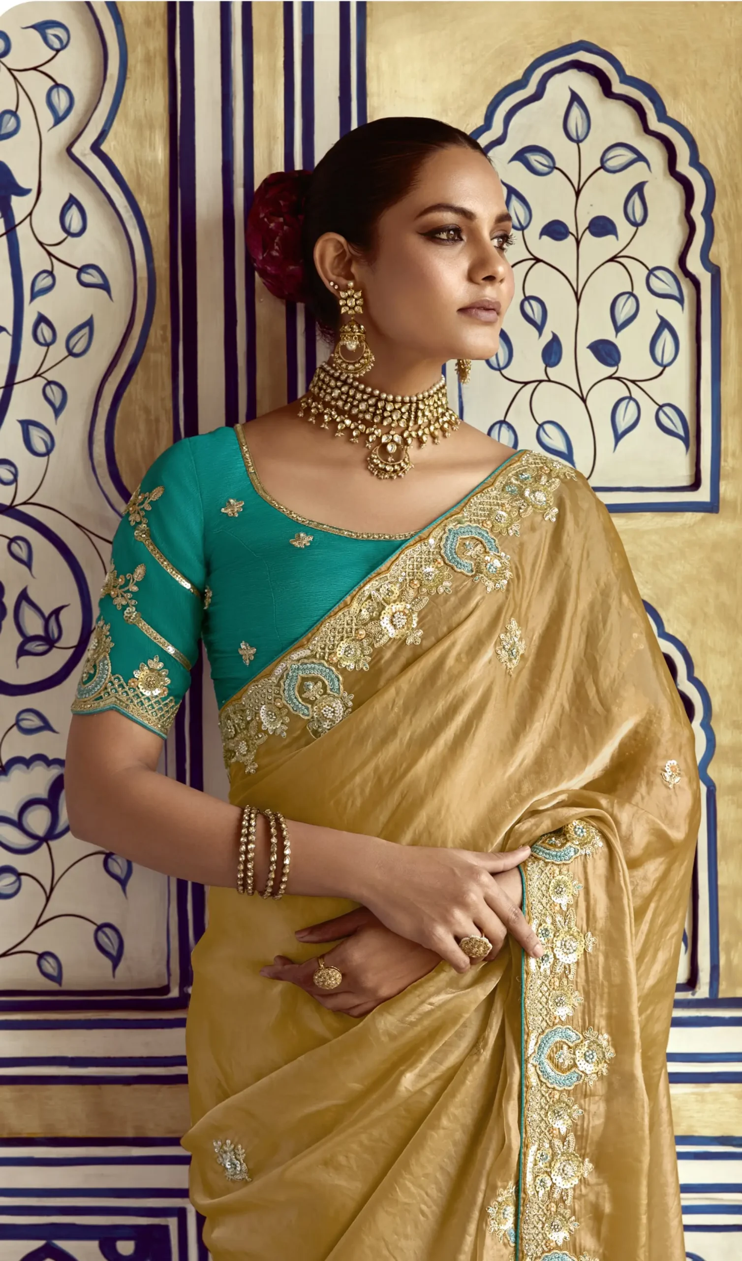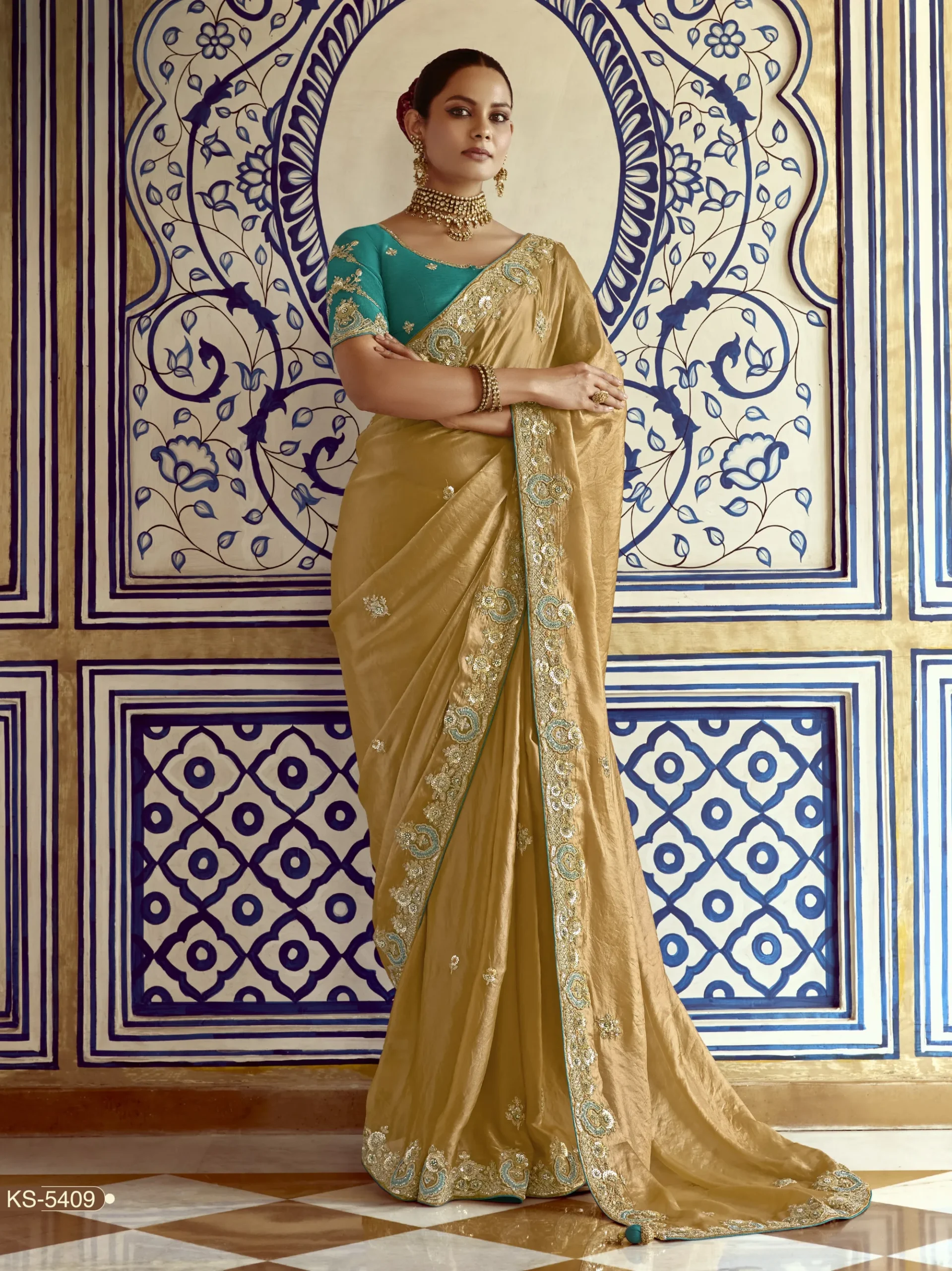 The warm golden-beige hue offers a regal glow, making it ideal for evening parties, receptions, and festive occasions. Styled with a matching fancy blouse with embroidery, this saree captures the charm of premium ethnic fashion.