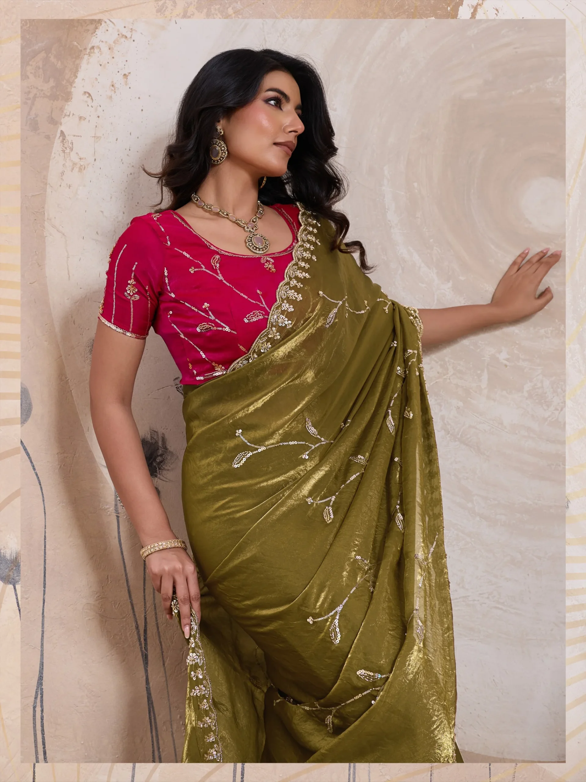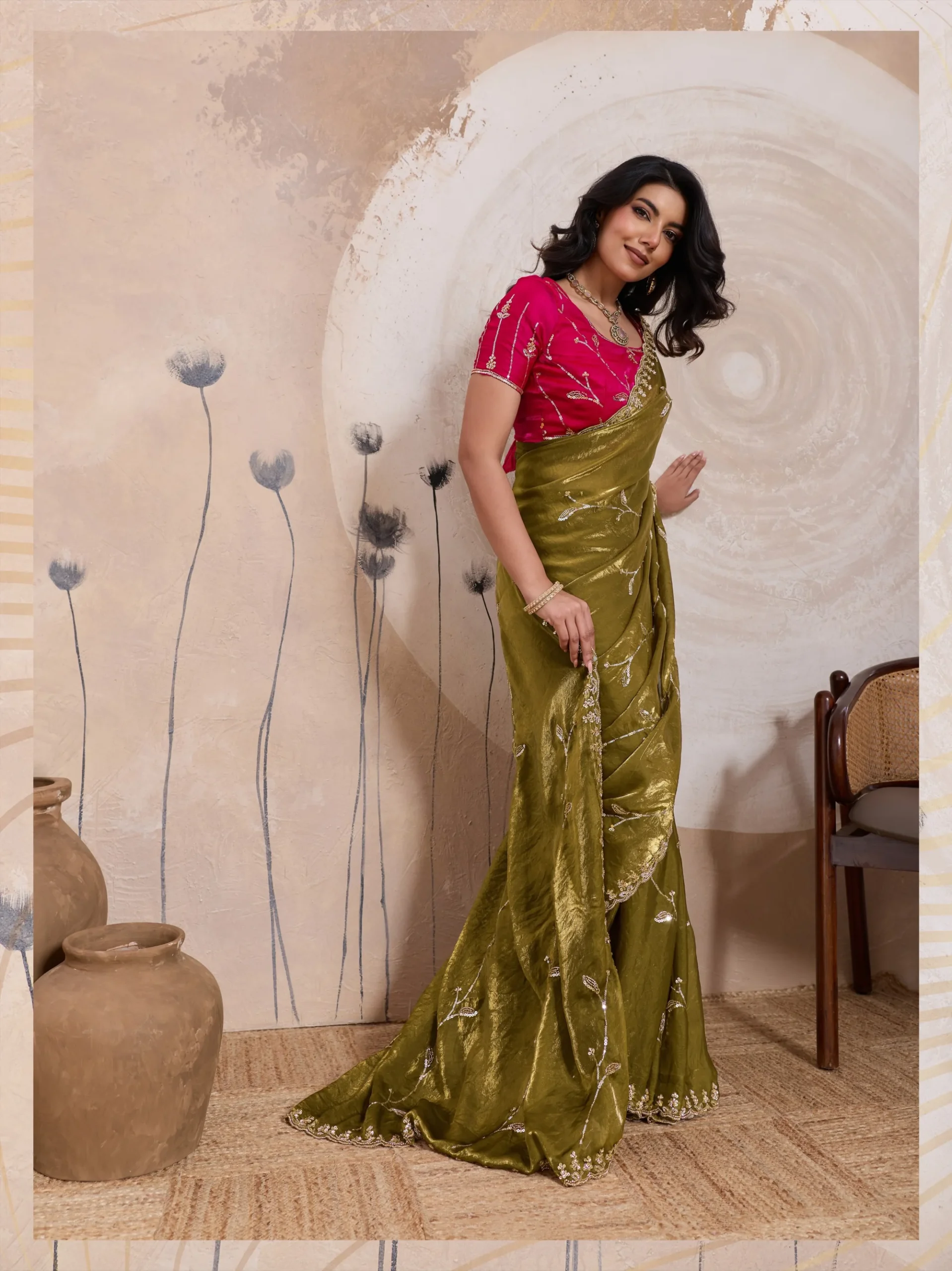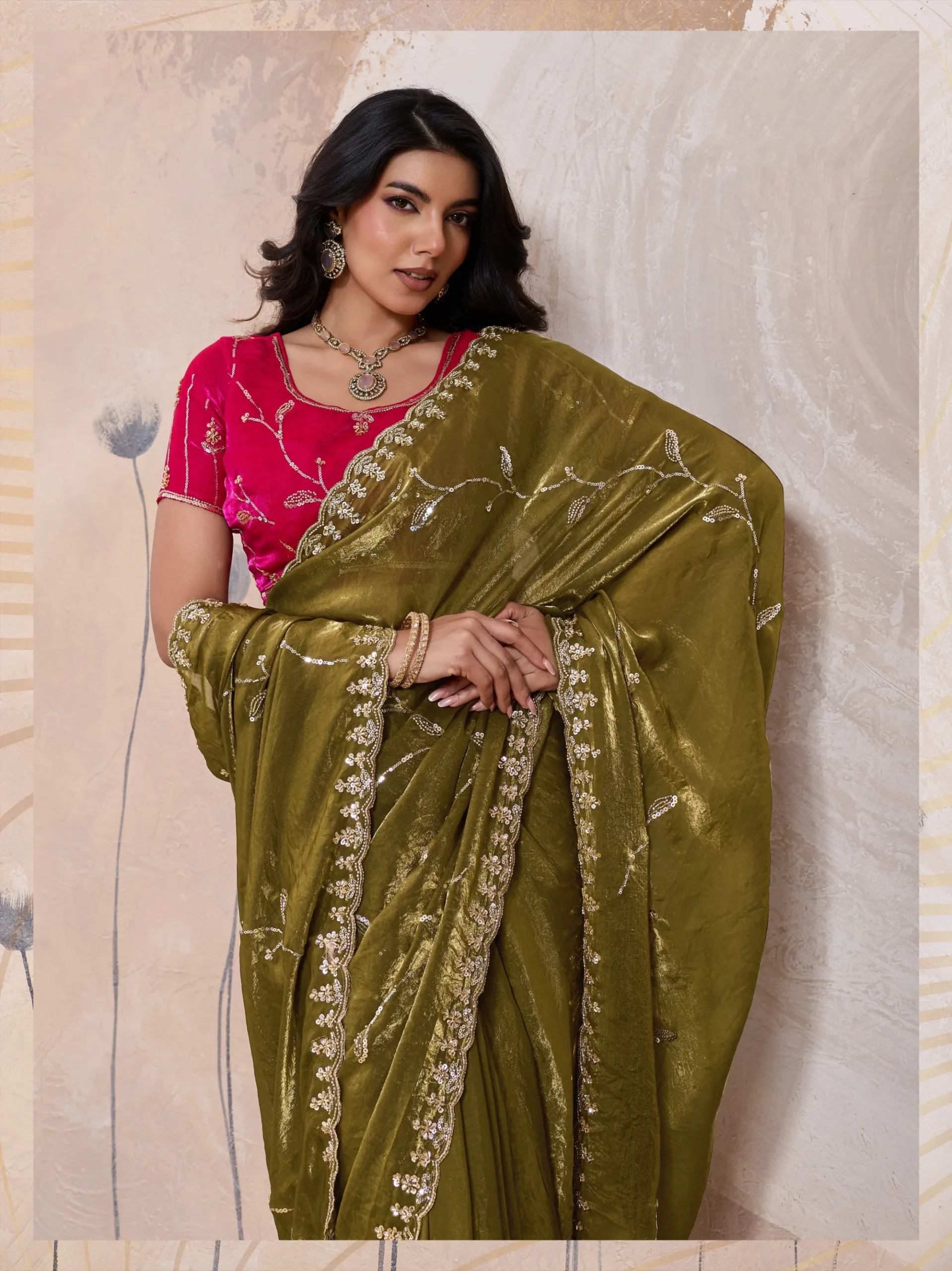A unique blend of earthy elegance and royal charm, this olive gold metallic fandy satin saree features beautifully detailed cutdana, beads, sequins, and zari embroidery in a C-pallu concept. The vine motifs and couture worked blouse give it a refined, luxurious finish.