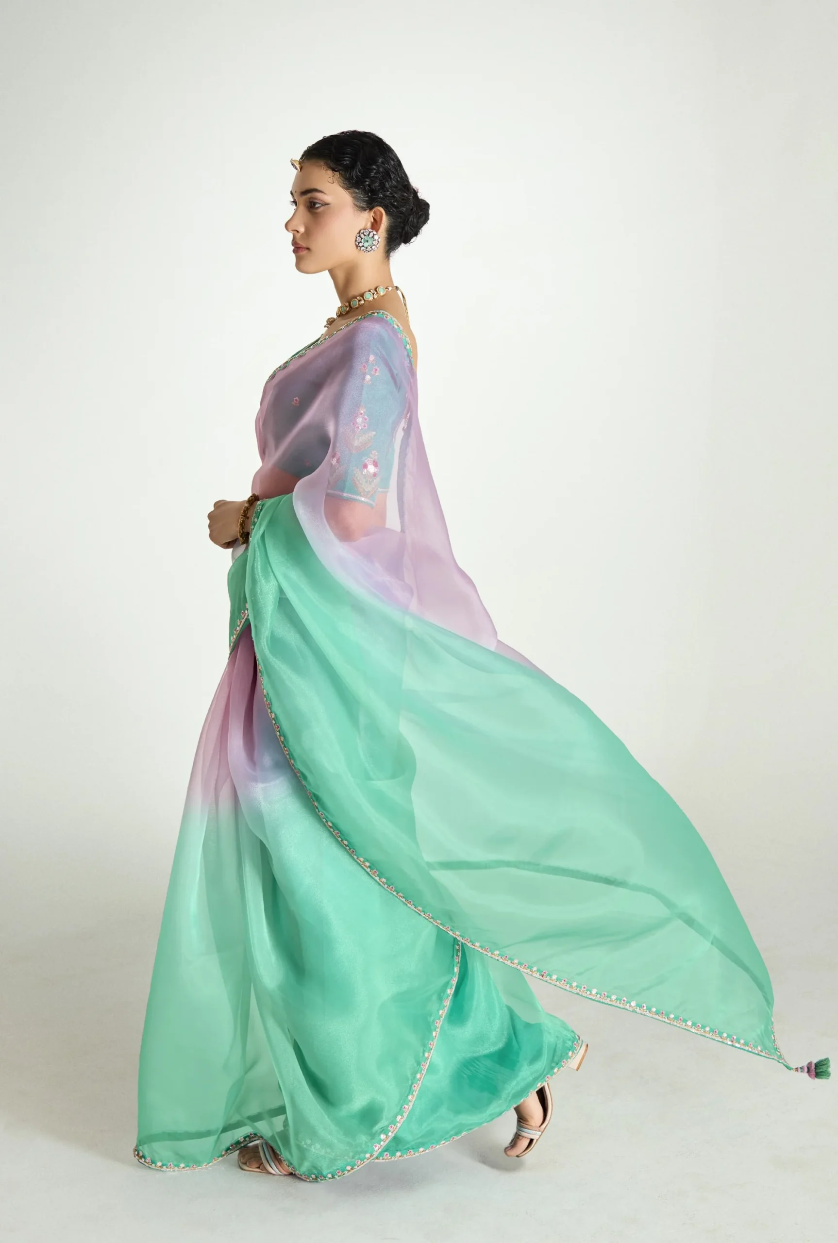 Crafted in delicate organza tissue silk, this saree exudes a lightweight yet regal appeal. The fabric is beautifully enhanced with intricate heavy butta embroidery and a richly worked border, showcasing fine craftsmanship that reflects refined artistry. The subtle sheen of organza tissue adds depth and sophistication, making every drape effortlessly graceful.