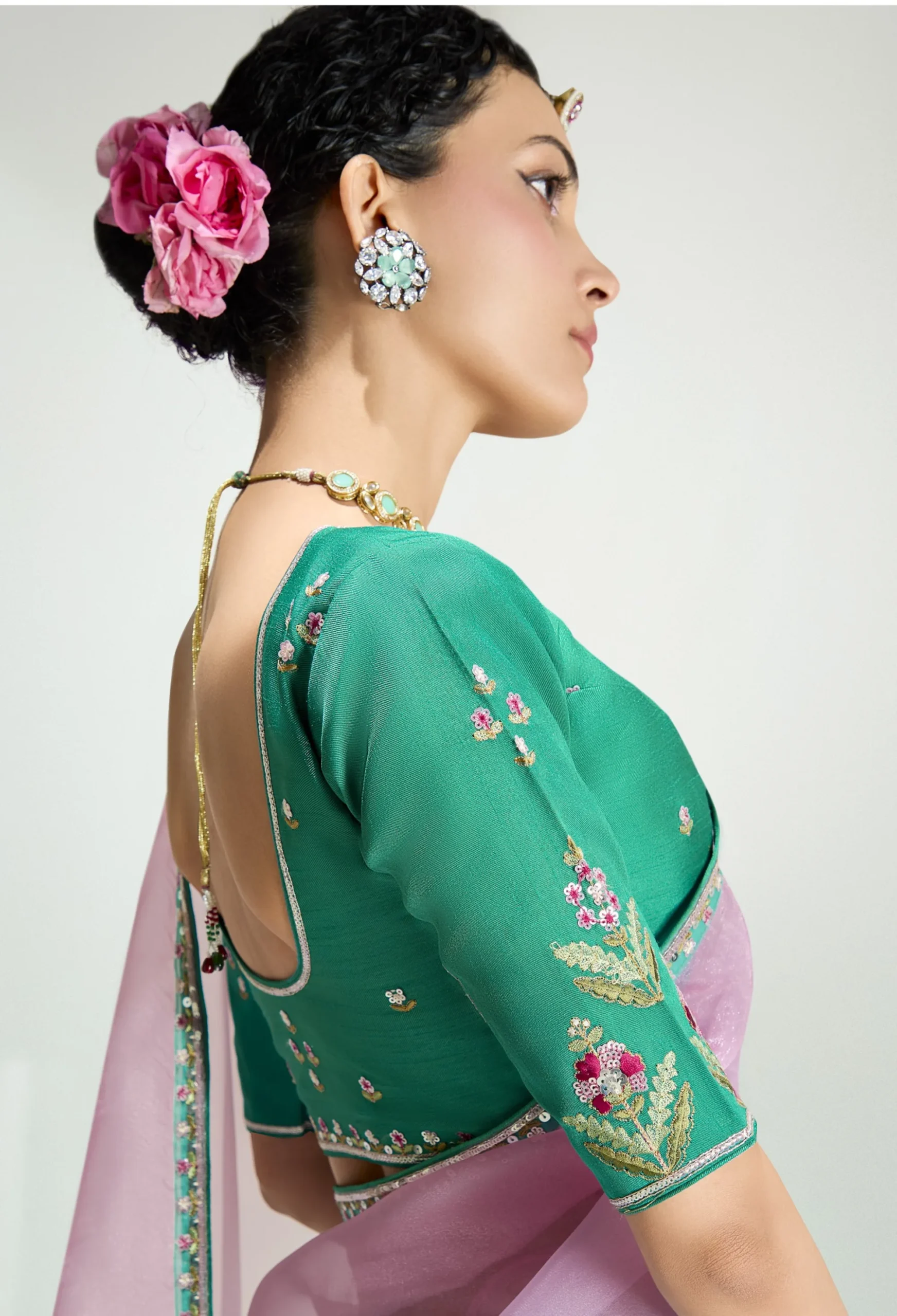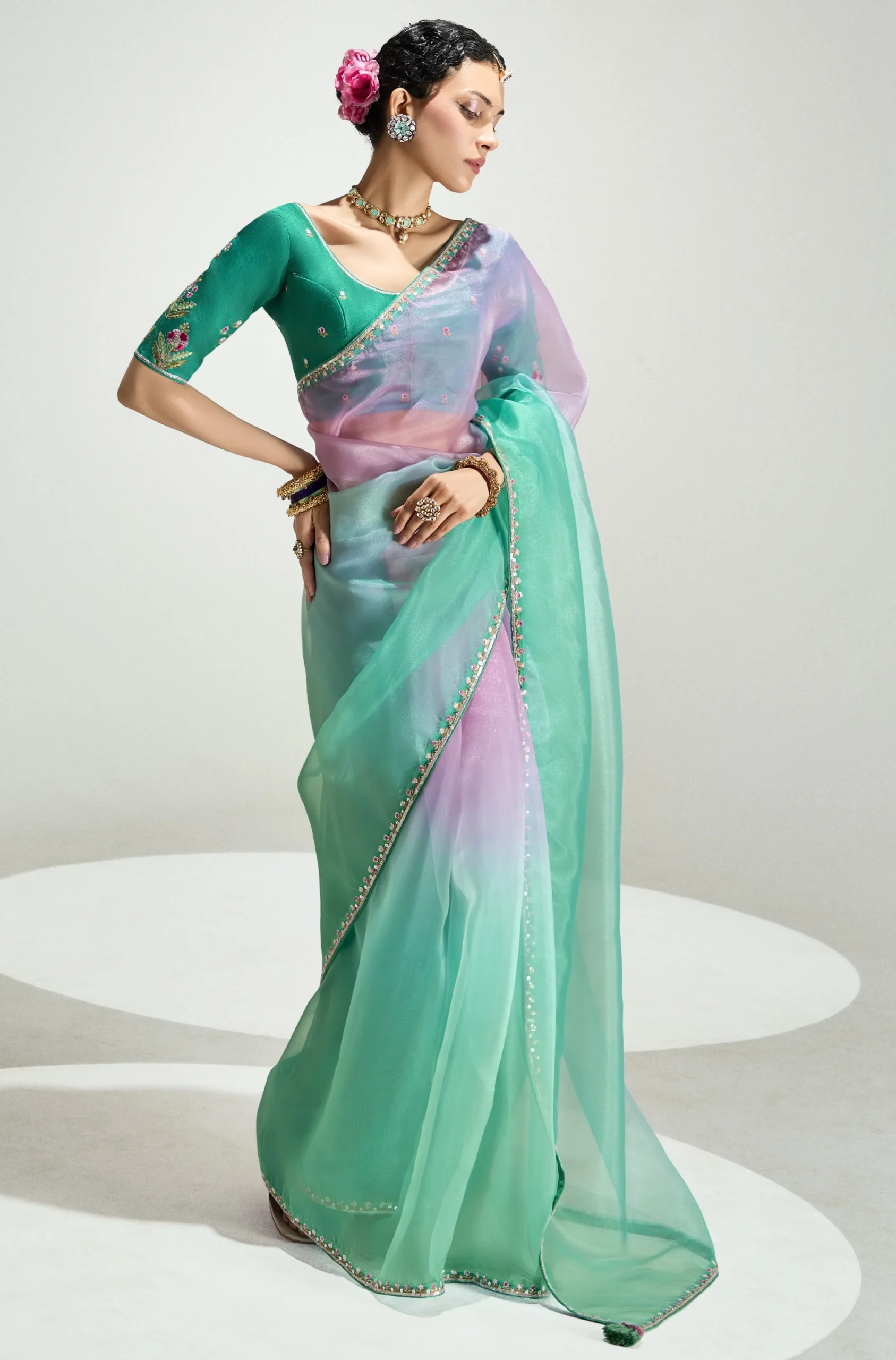 Paired with a designer heavy work blouse featuring sleeves and detailed back work, this ensemble elevates your festive and party look with statement elegance. The embellishments, likely featuring sequins and thread embroidery, add a refined shimmer without overpowering the saree’s graceful aesthetic.