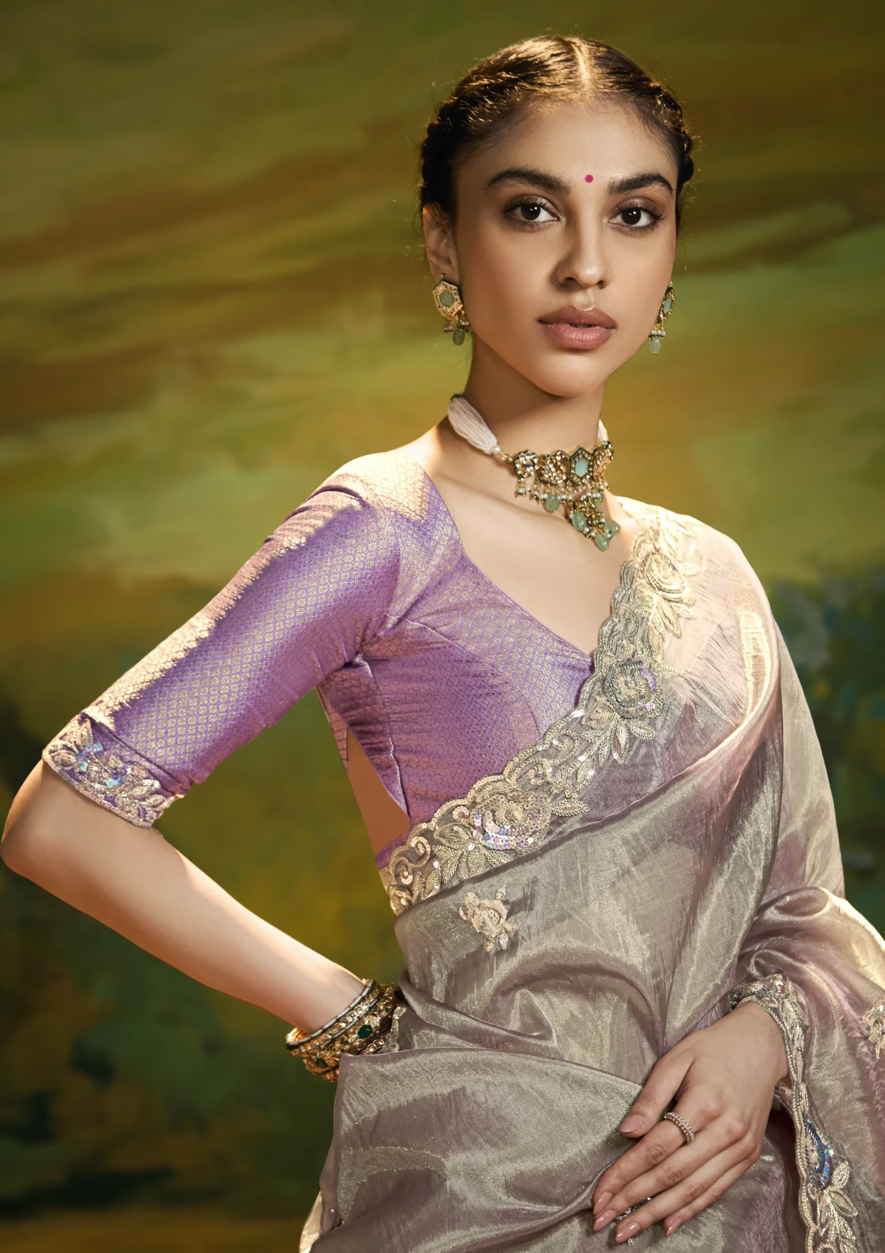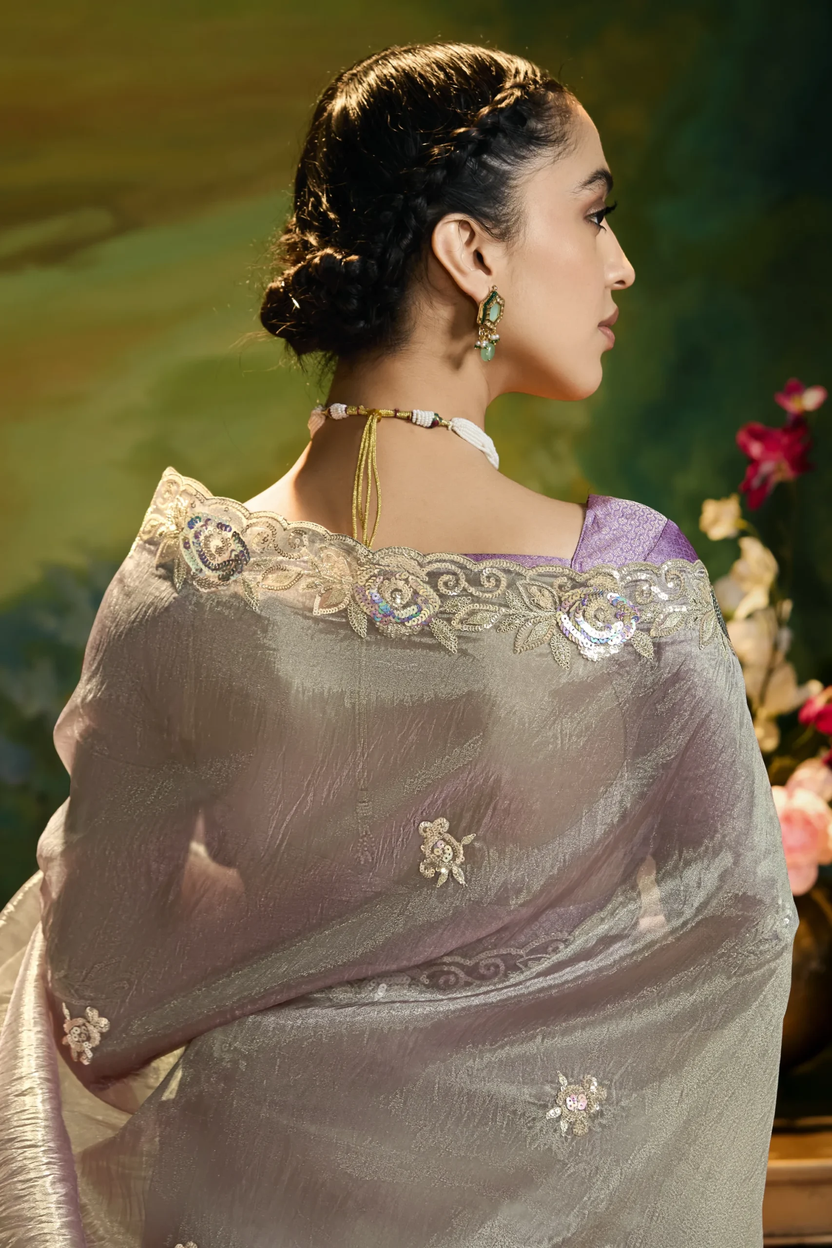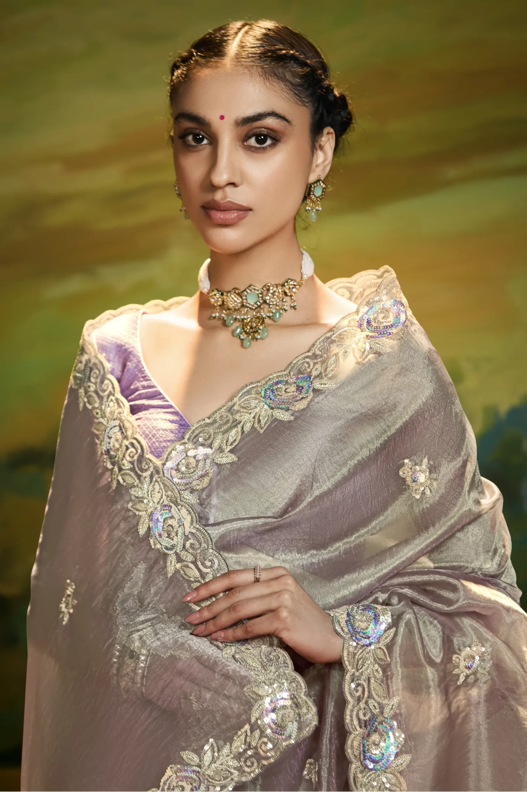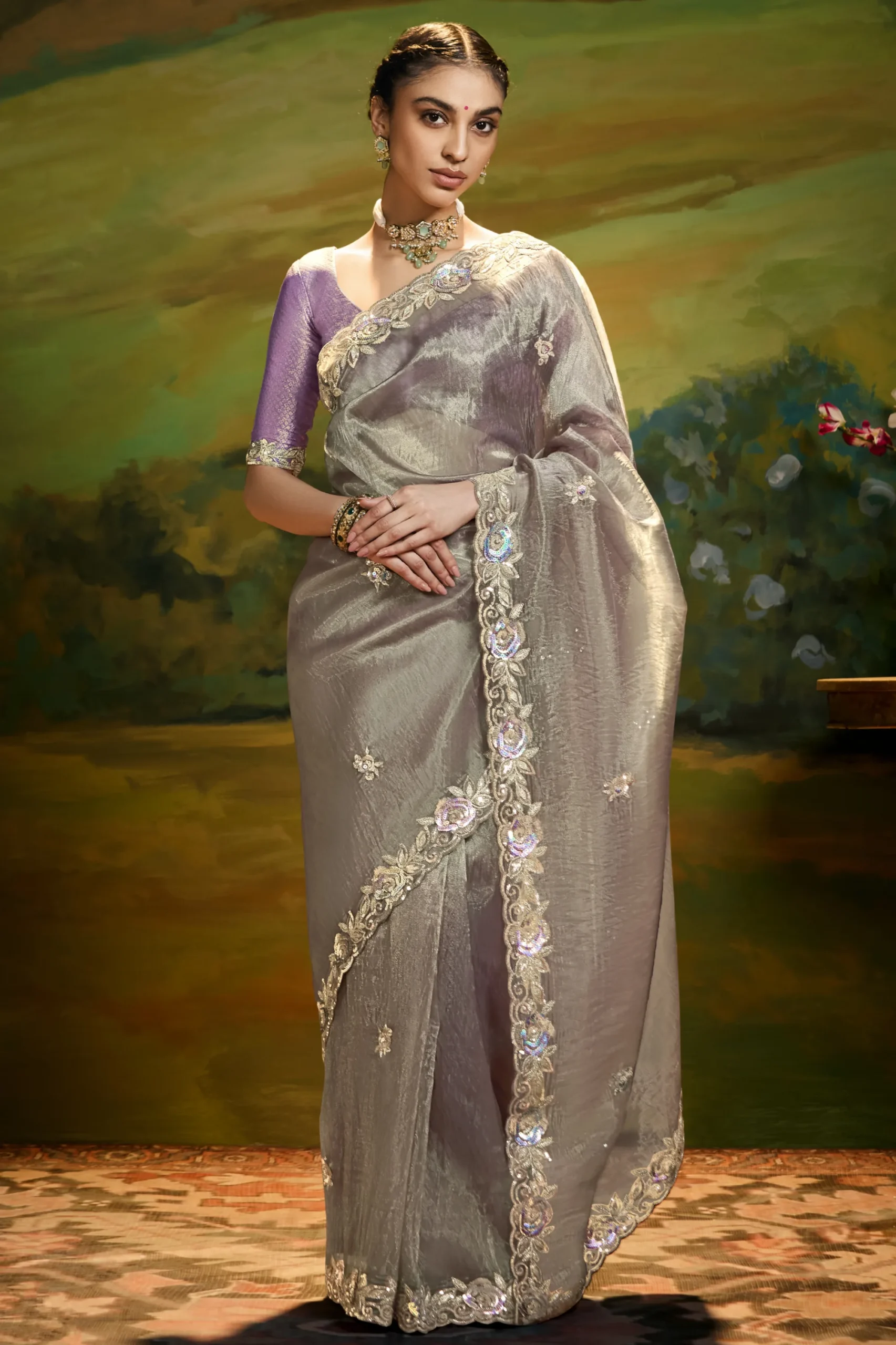Crafted in soft fancy fabric, this pearl grey saree is enhanced with elegant embroidery and fine handwork. The designer border gives it a polished finish, suitable for refined parties and special evenings.