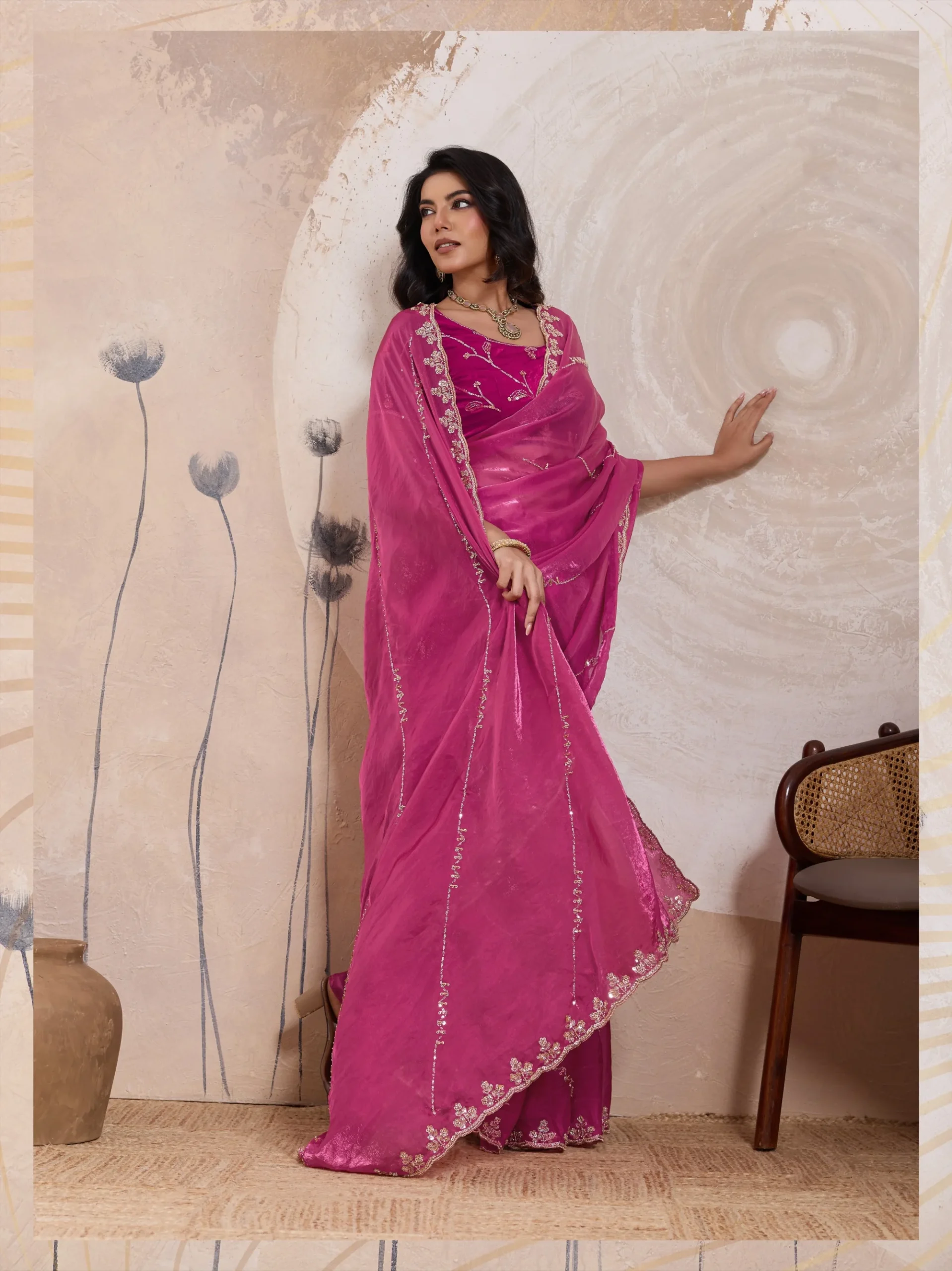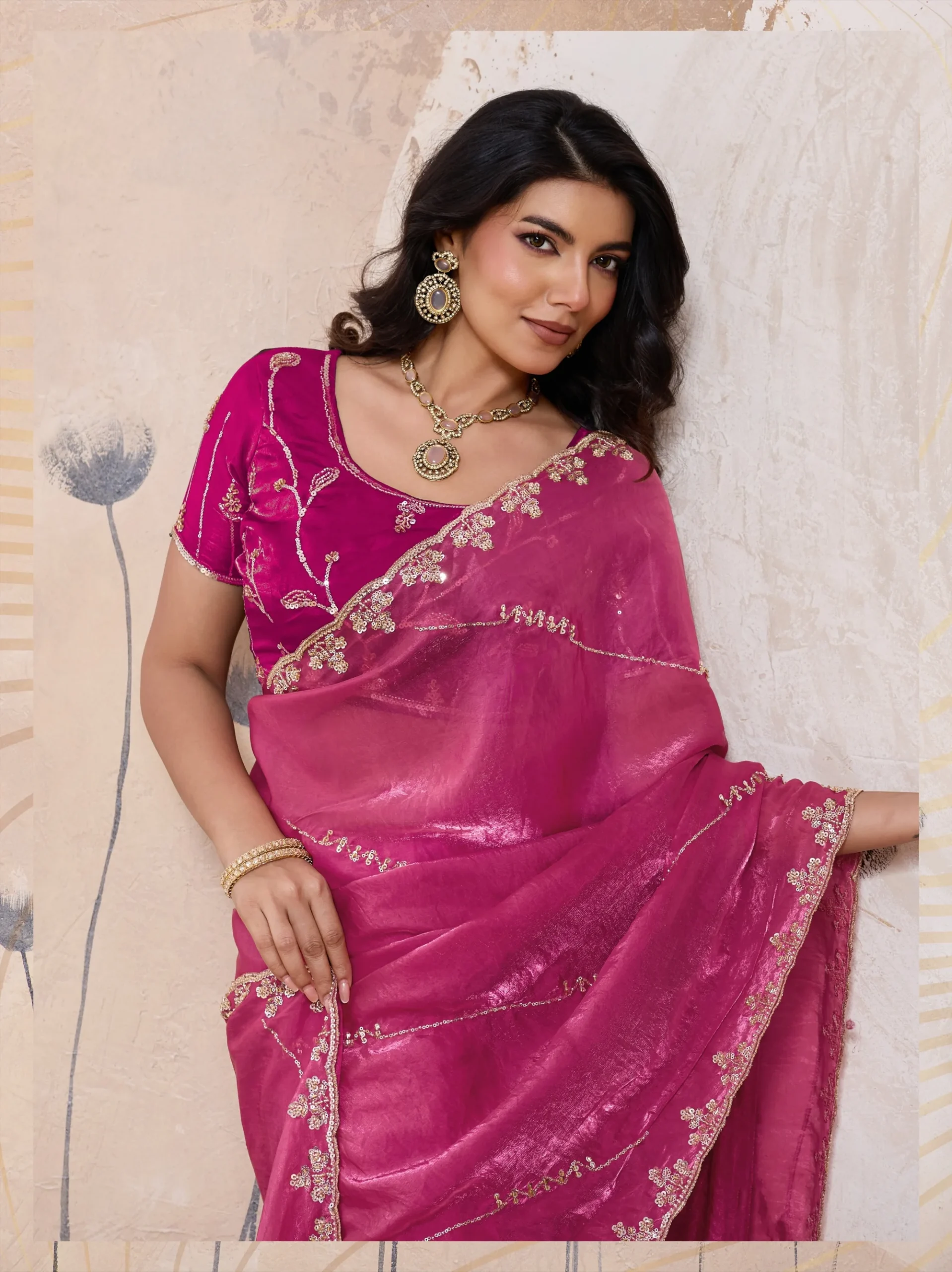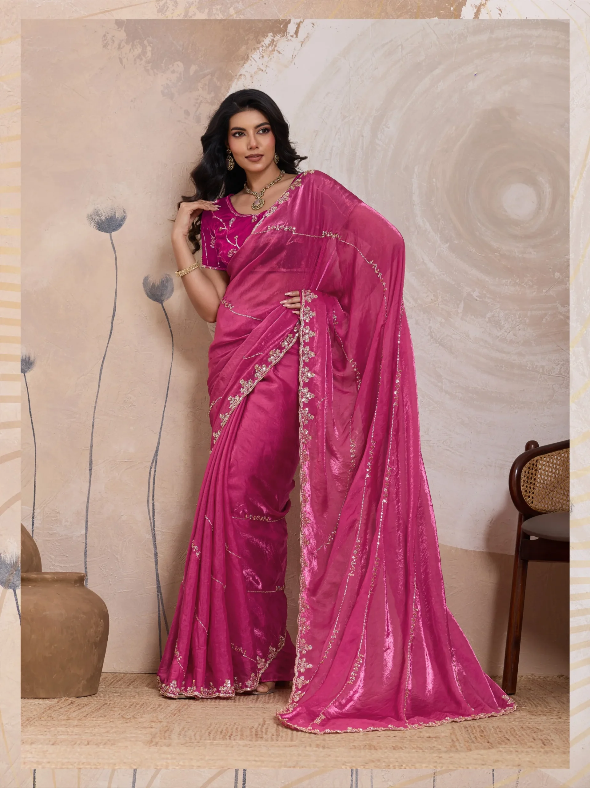 Bold yet graceful, this royal rani saree is crafted for women who love statement elegance. The luminous metallic fandy satin fabric is adorned with cutdana, beads, sequins, and zari embroidery in a stunning C-pallu design. Finished with a couture-theme worked blouse, this saree is perfect for grand celebrations and evening parties.