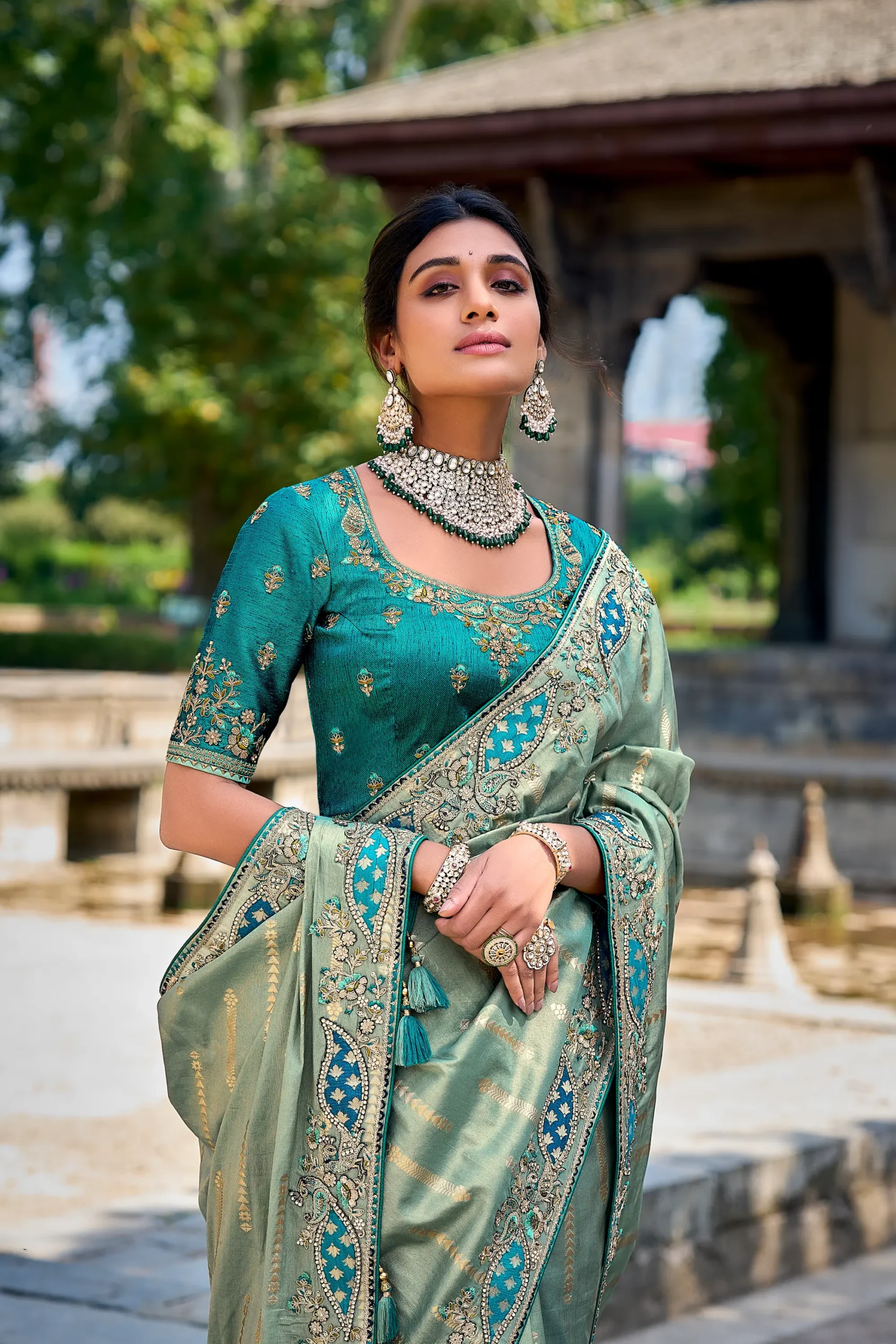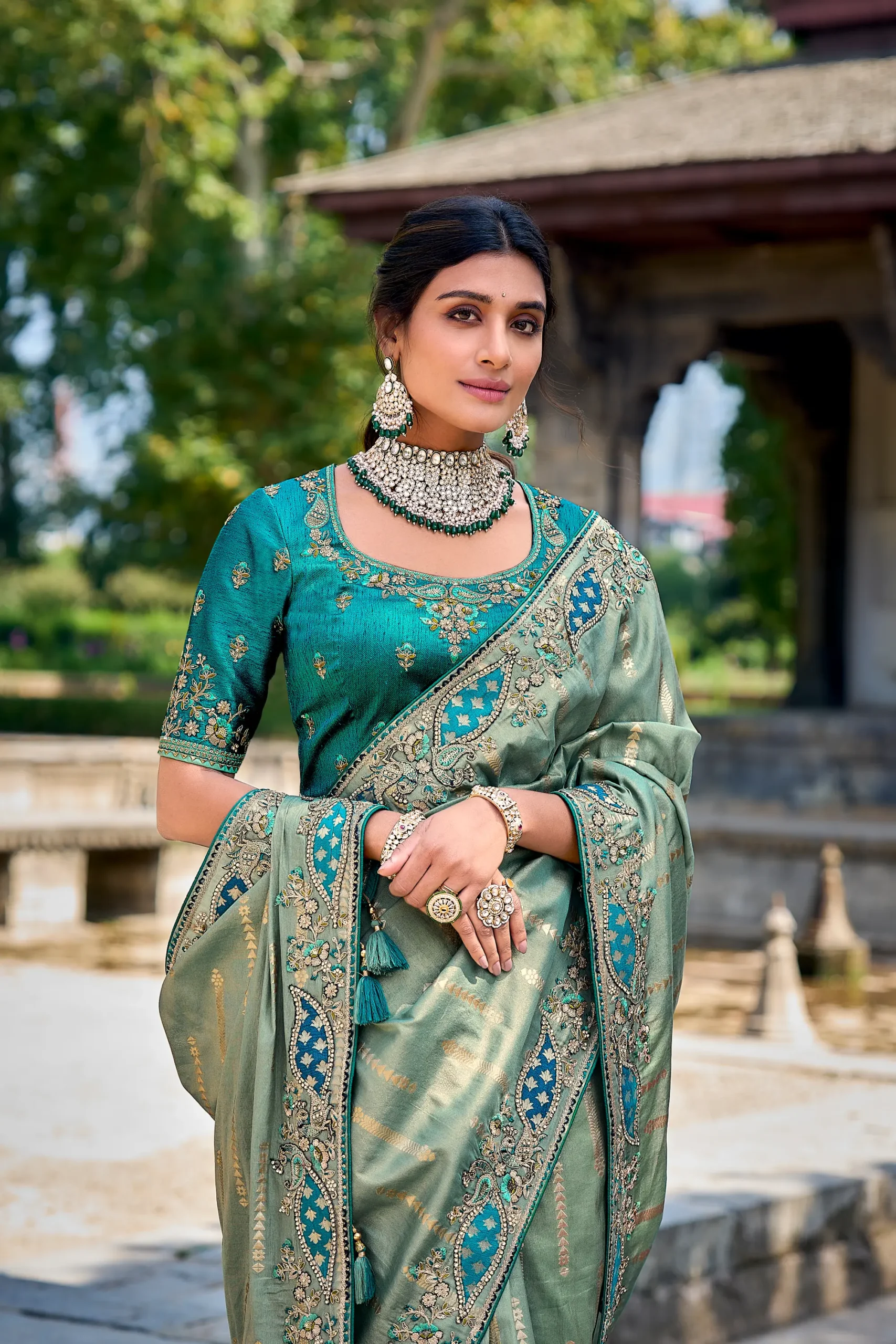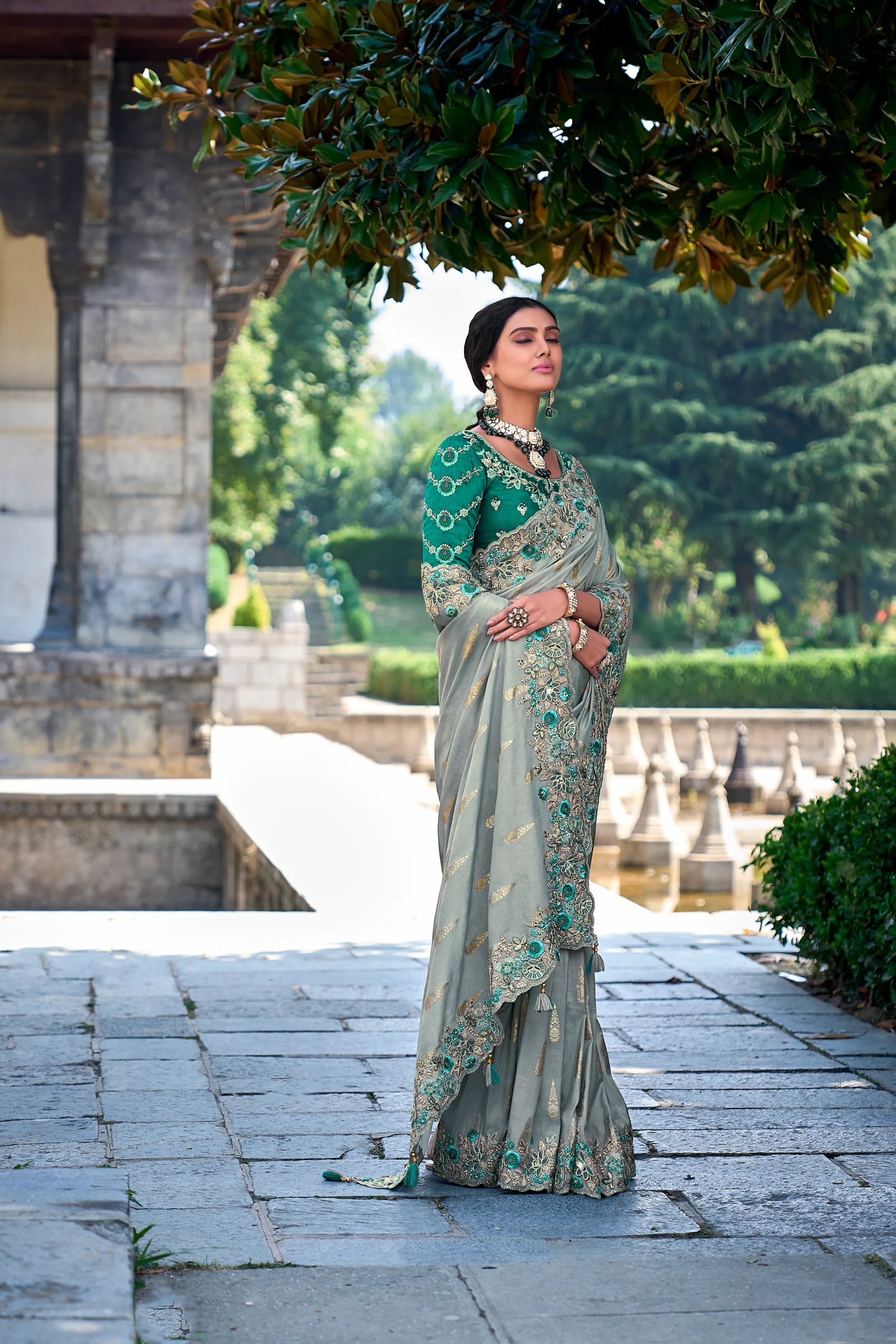 The vibrant yet balanced color palette adds depth and sophistication, making it perfect for special occasions where you want to stand out with grace. Every detail reflects skilled craftsmanship, ensuring the saree drapes effortlessly while maintaining its regal appeal.